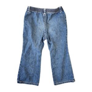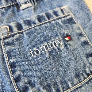 Vintage Tommy Hilfiger Jeans Elastic Waist Blue Denim Flare Pants Girls 4T Patch Pocket Embroidered Brand Logo And Spell Out Y2k Style Preppy Retro Style.