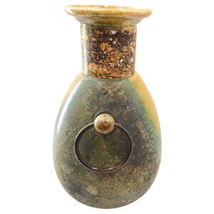 Vtg. Tony Evans Large Raku Vase Brass Handles Signed Spotted Glaze Metal Collar