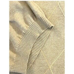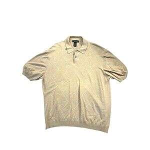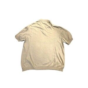 The Vtg Toscano XXL 2XL Short Sleeved Sweater is a classic piece of men's clothing made in Italy. This tight-knit wool sweater features a solid tan color with a diamond print, accented with 2 buttons on the collared neckline. The pullover style and 90s theme add a touch of vintage charm to this wardrobe staple, perfect for a casual day out or a round of golf.