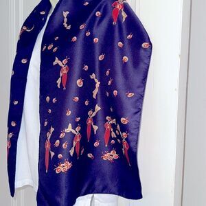 Vtg Transform dark purply blue polyester scarf with person in red outfit print