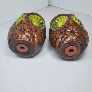 Vtg Treasure Craft Owl Salt & Pepper Shakers Green Eyed Brown Floral Owls