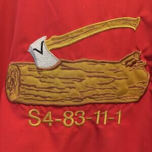Back details: Large embroidered axe-and-log graphic with code "S4-83-11-1"