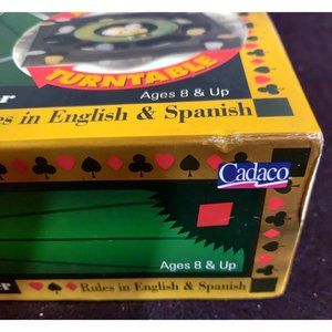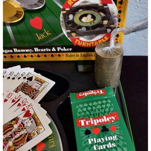 Pre-owned in open box condition. Chips still in original package as well as the bottom of turn table, still taped. Checked for full deck in great condition with jokers. There are minor box wear. (The way the sticker was adhere was slightly uneven, that's about what I can tell is been used. Please review photos for additional details. As is.