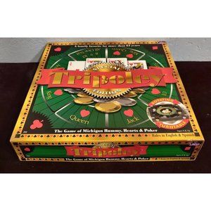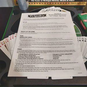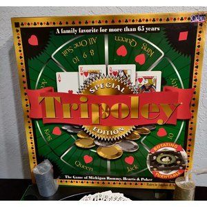 Vintage Cadaco Special Edition Tripoley The Game Of Michigan Rummy, Hearts & Poker from 2000 and is in nice complete condition. Has rotating gaming tables, comes with chips and cards. Tripoley collector item.