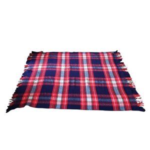 Vtg Troy Oversize Plaid Wool Fringe Throw Car Lap Stadium Bed Blanket 70" x 60"