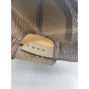 Hat is in used condition. Adjustable strap is brittle and cracked. A piece has broken off and will most likely need to be replaced. Bill cardboard is cracked as well, though it does seem to hold up when worn. See pictures to ensure you are satisfied with the condition.