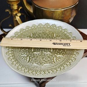 Keywords: pedestal cake stand, vintage Turkish glass platter, white gold dessert server, retro serving dish, wedding cake display, boho kitchen decor, stand de torta, bandeja vintage.