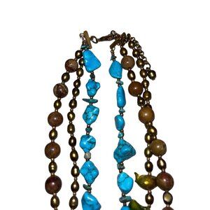 Vtg Turquoise Green Iridescent & Brown/Green 3-Strand Beaded Necklace, Statement