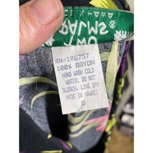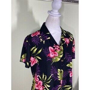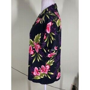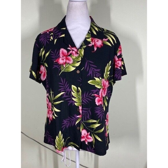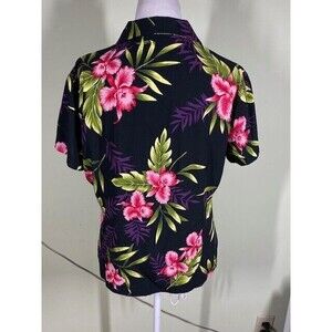 Get ready to embrace the tropical vibes with this vintage Two Palms Hawaiian Aloha Orchid Fern Button-Up Blouse. Made in Hawaii, this lightweight and breathable rayon blouse features a beautiful floral pattern with black color and cap sleeves. The collared neckline and button closure add a touch of elegance to this blouse, making it perfect for any occasion, be it a casual day out or a party/cocktail event. This regular fit blouse comes in size S and is easy to care for with hand wash only. The blouse is perfect for summer, fall, and spring seasons and is a great addition to your wardrobe. The blouse is perfect for those who love vacations, Hawaiian, and tropical themes. Get your hands on this beautiful blouse and embrace the tropical vibes.