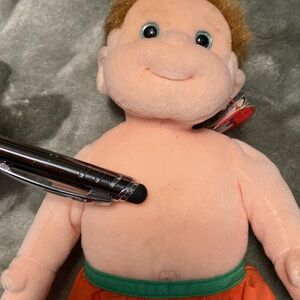 Buzz (1997) in orange swim trunks with spiky brown hair and blue eyes. He's a typical boy and has a little dirt on his chest. Noted in pic.