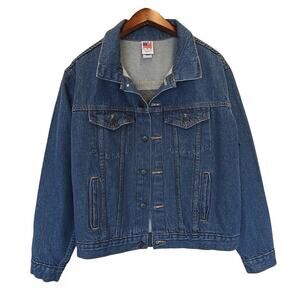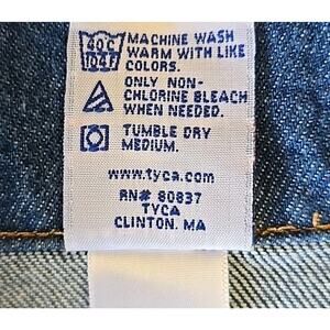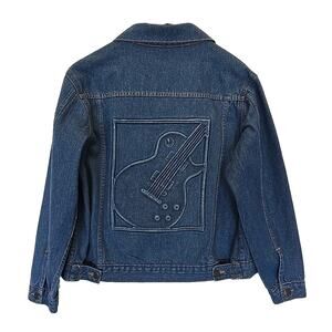 This vintage Tyca men's denim jacket features an embossed guitar design, perfect for those with a love for rock and roll. Made of cotton denim in a solid blue color, the jacket has a button closure and a classic trucker style with a collared neckline. With a size M and a regular fit, this piece is machine washable and a great addition to any music lover's wardrobe. Made in the USA, this jacket captures the essence of American rock music and the rockabilly era.