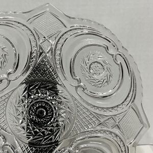 Vtg US Glass Buzz Saw in Parenthesis Victoria Daisy & Scroll Clear Plate 10.5”