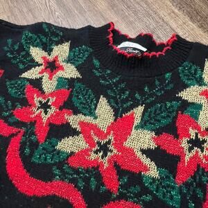 Vtg Ugly Christmas Sweater Womens Medium Black Red Poinsettia Dana Scott 80s