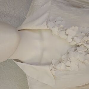 This elegant white blouse features delicate heart ruffles for a sophisticated look. Perfect for any occasion.