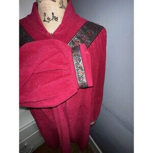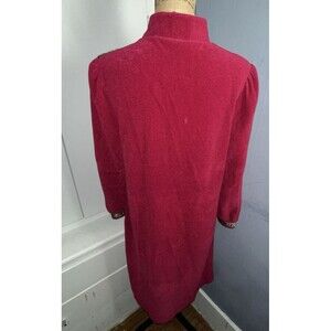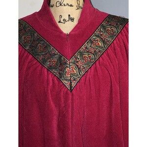 This vintage Vanity Fair fleece zip robe housecoat in size Large features embroidered pockets, a collared neckline, and long sleeves, making it a comfortable and stylish option for everyday wear. The wine color, solid pattern, and retro theme give it a unique and classic look. Made of polyester fleece, this robe is machine washable for easy care and is perfect for the winter, fall, and spring seasons. With zipper accents and a USA brand, this robe is a cozy and charming addition to any woman's wardrobe. Sleeves 23, pit2pit 24 and length 42. Ships Fast.
