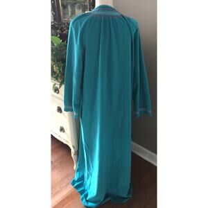 This vintage Vanity Fair robe is a must-have for any fan of 1980s fashion. The turquoise color and polyester material make it perfect for evening wear or as a comfortable housecoat. The robe features a half zip and pockets for added convenience.