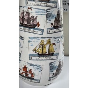 This vintage vase features a beautifully hand-painted design of historical sailing ships with gold trim, perfect for any nautical collector. Made of porcelain with a multicolor finish, this large oval vase stands at 13 inches tall and 3 inches wide. Produced in 1969, this mid 20th-century piece exudes a nautical theme and artistry, making it a unique and stylish addition to any home decor. Care instructions recommend cleaning with warm water, and it weighs 3 pounds. This vase is a licensed reproduction from the 1960s, showcasing intricate details and a timeless design that will complement any space, whether for teens or adults.