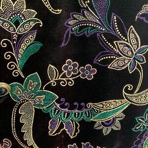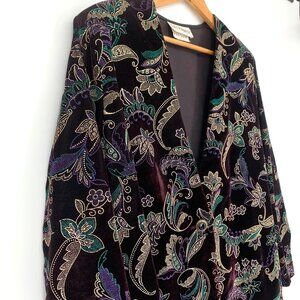 Bold and unforgettable, this vintage Très Paquette Byer California velvet blazer from the late 1980s to early 1990s features a rich black background adorned with an intricate beaded paisley floral design in green, gold, and purple. Every element of the shimmering pattern is embellished with delicate beadwork, creating texture and movement that elevate the drama of the piece. Made in the USA from a luxe acetate-nylon-rayon blend, this fully lined jacket boasts padded shoulders, a relaxed silhouette, and an ornate faceted gem-style button closure. A stunning statement layer for evening wear or standout vintage styling.