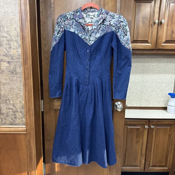 Vtg Via Sant Andrea Denim Shirt Dress Women Size 3/4 Floral Tapestry Cowgirl USA