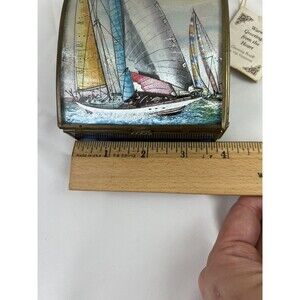 Vtg Via Vermont Sailboat Jewelry Trinket Box Cobalt Blue Glass Mirrored Brass
