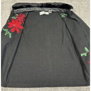 Victoria Jones petite Christmas/Holiday Sweater. In very good pre-owned condition. Looks to be in almost new condition however faux fur collar is missing one of the buttons on the neck, see pictures. Cardigan is embroidered with some sequins/beading. The sweater buttons from the inside and the outside buttons are decorative. Please see pictures for measurements and condition.