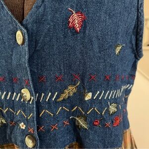 Vintage Victoria Jones plaid and denim maxi dress in a women’s petite size large. V neck and sleeveless with adorable embroidered fall leaf details on denim bodice. Button down closure and tie at back to give a more fitted look. Great layering piece for transitional weather.