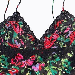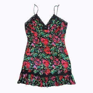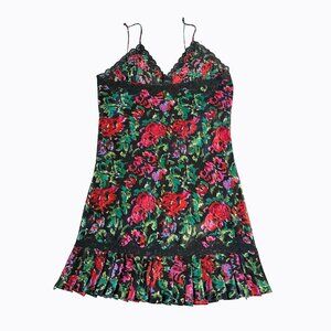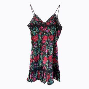 Discover a touch of vintage allure with this genuine 80s Victoria's Secret Gold Label floral slip dress. This charming babydoll chemise features a vibrant multicolor floral pattern in red, fuchsia, and green against a classic black base, adorned with intricate black lace detailing on the V-neck babydoll bodice. Crafted from lightweight and breathable satin fabric, this pullover nightie offers comfort and style, complete with delicate spaghetti straps that have adjustable ties for a perfect fit.