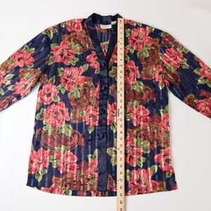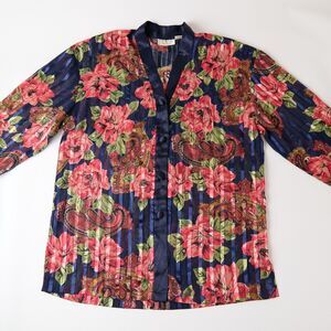 Beautiful vintage 90s Victoria’s Secret Gold Label night shirt in a rich navy blue with bold floral and paisley prints. Made from silky, lightweight polyester with a luxurious satin-like sheen. Features a button-front closure, elegant 3/4 sleeves, tonal fabric-covered buttons, and a mandarin collar. Perfect for vintage sleepwear, loungewear, or as a statement layering piece.