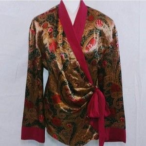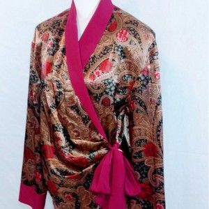 Rare,vintage satin robe, Victoria’s Secret loungewear, luxury sleepwear, paisley kimono, elegant dressing gown, padded shoulder robe, ruched satin robe, short kimono wrap, high-end loungewear, luxe at-home outfit, feminine sleepwear piece, giftable robe, classic satin robe, relaxed luxe wear, designer kimono