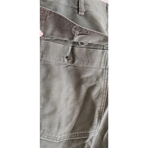 This is a pair of authentic vintage OG-107 military pants that came back from Vietnam. They are marked size 32 x 33, but please see the measurements below. They are the khaki green cotton sateen fabric with a button fly closure. Perfect for those who appreciate American vintage fashion and military aesthetics.