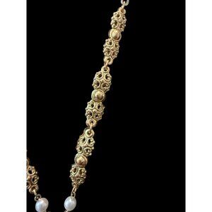 An elegant vintage necklace featuring faux turquoise and faux pearl accents and intricate gold-tone detailing. A timeless piece for adding sophistication to your look.