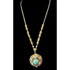 Vtg W Germany Gold-Tone Necklace Faux Turquoise & Pearl Filigree Pendant SIGNED