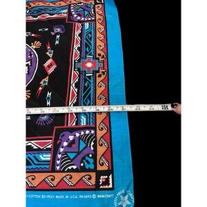 This product is a vintage Wamcraft handkerchief bandana with a Southwestern Aztec design, made in the USA in the 1980s. The colorful multi-color pattern features a tribal style that is perfect for outdoor activities like hiking. Made from a cotton blend material and measuring 21x21, this handkerchief bandana is suitable for adult unisex wear. The brand's reputation for quality craftsmanship makes this accessory a unique and stylish addition to any wardrobe.
