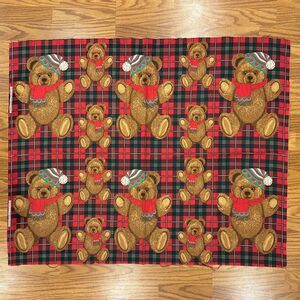 Red & Green Plaid Fabric & Red Fabric with Large and Medium Brown Christmas Teddy Bears
