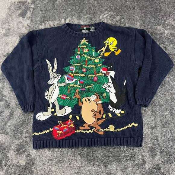 Vtg Warner Bros Eagles Eye Chunky Knitted Looney Tunes Christmas Sweater Sz M*. **Some snags on sweater as shown in photos; no other flaws noted. Refer to all photos for condition and sizing. Color is navy blue.