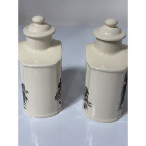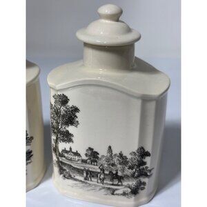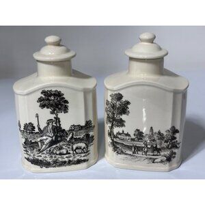 A decorative and functional tea caddy set featuring intricate black and white pastoral scenes. Adds charm and practicality to any kitchen or display.