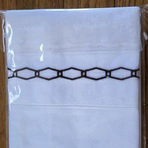Two nice quality, cotton pillowcases with chainlink design embroidered on end in Espresso brown. New with tags in original packaging.