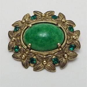 Vtg West Germany Green Cabochon Glass & Rhinestone Goldtone Floral Pin Brooch