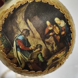 Vtg West Germany Silk Glass hand decorated Nativity ball Christmas ornament. Small half inch scratch to the paint (pictured above) otherwise in Excellent vintage condition. Please see all pictures for details, measurements and condition.