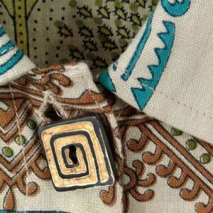 COTTON/ linen high quality woven fabaric with cool boho print mix stretchy in beige brown and turquoise geo floral with wood and seashell beaded accents , cool wooden geo spiral buttons and long sleeves, light shoulder pads.