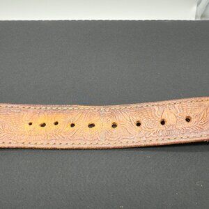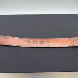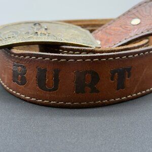 Vintage tooled leather name belt featuring "BURT" and a covered wagon belt buckle. Crafted by Justin, this unique piece adds Western flair to any outfit. Ideal for collectors or as a standout accessory.