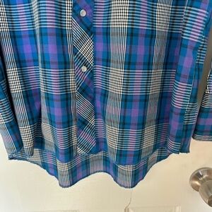 This vintage Wrangler Western shirt is perfect for casual or workwear occasions. The blue plaid pattern is complemented by a collared neckline and snap closure, while the long sleeves feature pearl snap buttons. Made from a lightweight cotton blend, this button-up shirt also includes pockets for added convenience. The shirt is a size 16.5 and has XLong tails for a true cowboy cut. The shirt is perfect for those who love the Western or cowboy theme and is a great addition to any wardrobe.