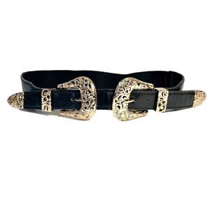 Vtg Western Stretch Faux Black Leather Gold Tone Double Buckle Womens Belt XS S