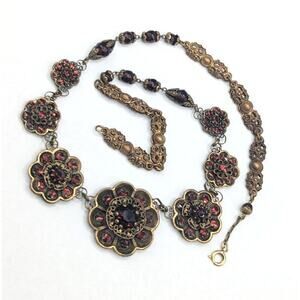 Vtg Western West Germany Or Czech Red Rhinestone Brass Tone Flower Necklace **