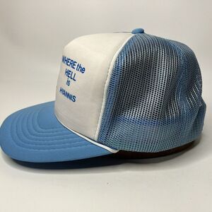 A vintage "Where the Hell is Hyannis" Nebraska souvenir trucker hat or cap with rope, mesh back, and adjustable snap strap. Blue and white. Hat is in clean, pre-worn condition with slight signs of use along inside rim. See photos for complete description.