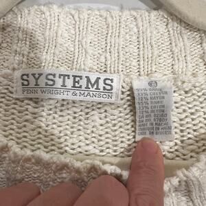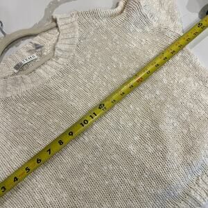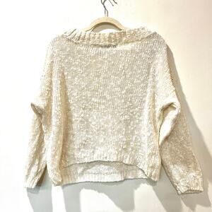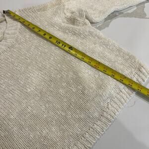 Good used condition. This is a looser nubby knit sweater in a ramie cotton blend that feels like a soft cotton. Overall the knit is in good condition. Small hole to the left of the collar that isn’t noticeable when wearing but is visible in the collar photo