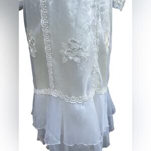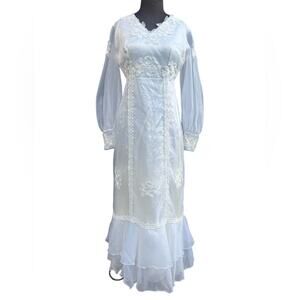 Vtg White Floral Lace Applique Handmade Sheer Sleeve Ruffle Bottom Wedding Dress