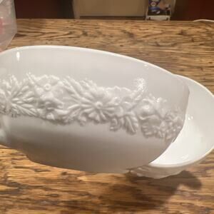 Excellent condition no chips or cracks. Beautiful embossed floral pattern goes all the way around the cups. Two handles each 5 inches in diameter. These are beautiful vintage pieces! The white collar guarantees that go with just about anything. This is a four piece set. These have a tiny stamp in the middle of the underside that I cannot quite make out, but it appears to be a V. See photo. I believe these are from Vitrock.
