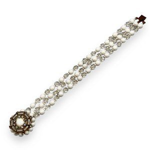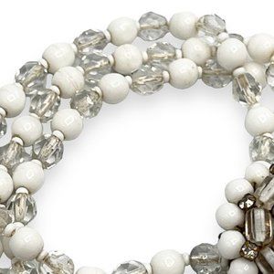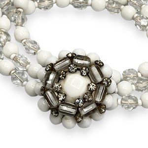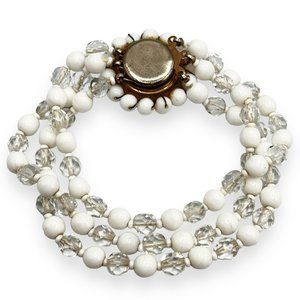 Vtg White Milk Glass & Faceted Crystal Bead Multi-Strand Bracelet w/Fancy Clasp
