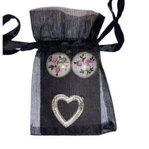 ⛱️ Vtg White & Pink Enamel 3 Piece Set in Gift Bag, Brooch + Button Earrings
